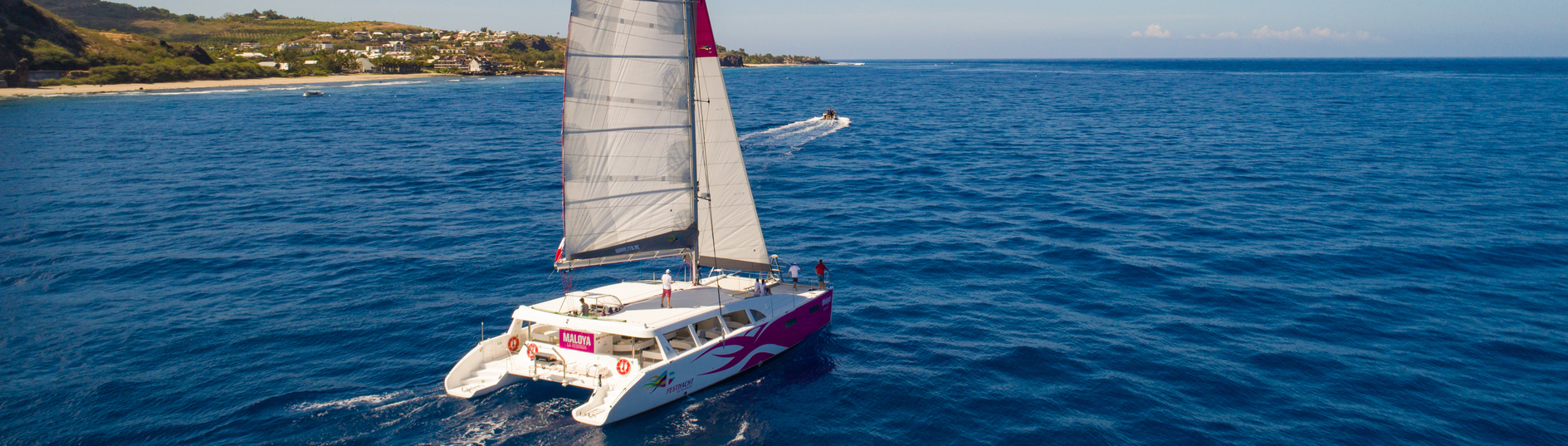 Le plus grand catamaran à voiles de l'Océan Indien offre un espace d'accueil confortable pouvant aussi bien s'adapter aux enfants qu'aux personnes du 3ème âge. Atypique et unique à La Réunion, ce bateau d'une grande élégance vous offre 230 m2 de pont dont une grande partie protégée du soleil et des éventuelles intempéries ainsi que de nombreux équipements ludiques.
